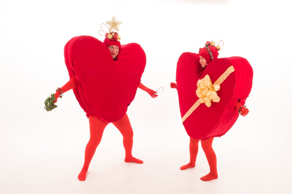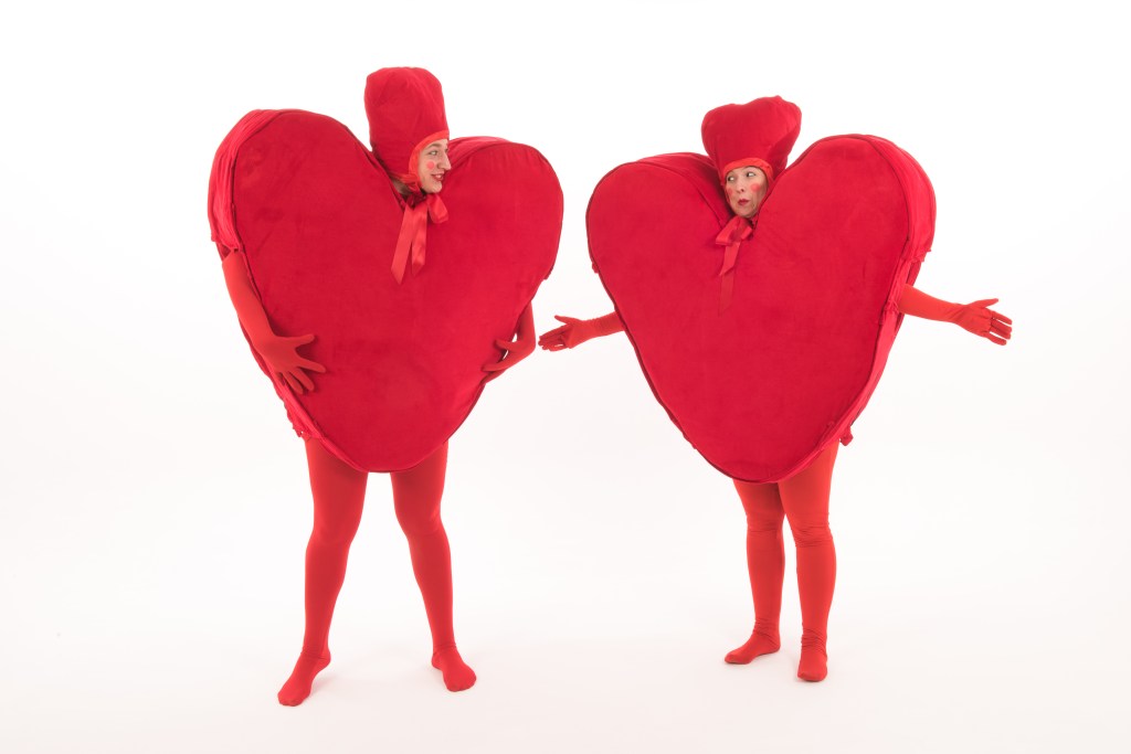 Two giant love-hearts looking for love! You are their one true love. The most beautiful person they have ever seen. They love you more than roses and kittens and sweeties and puppies. And they love your nan. And your dad. And that guy over there. Oo! She looks nice! Lets cuddle!